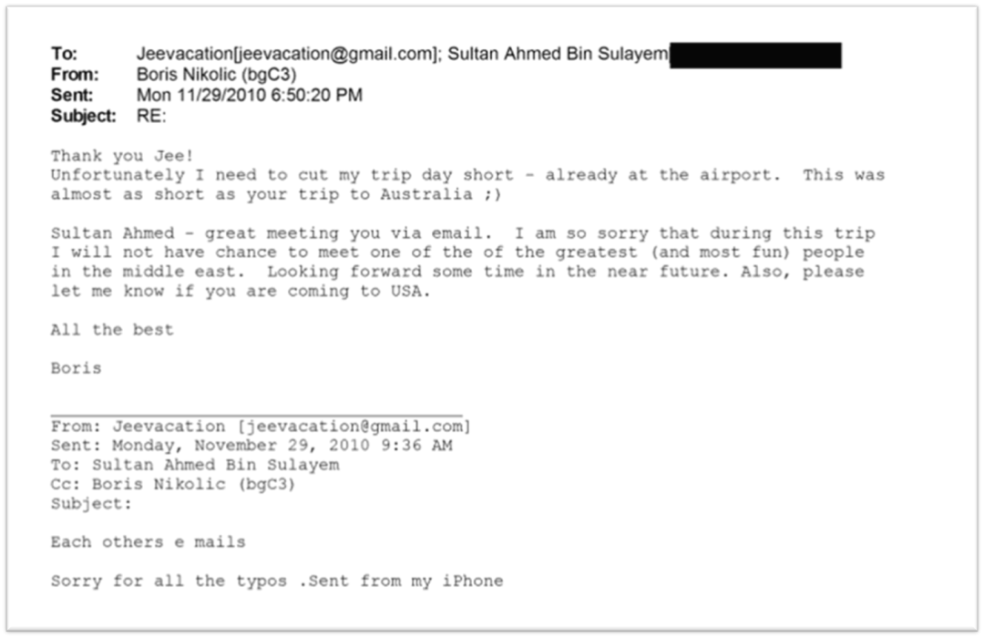 2010年11月,爱泼斯坦通过邮件介绍Boris认知Sultan Ahmed Bin Sulayem