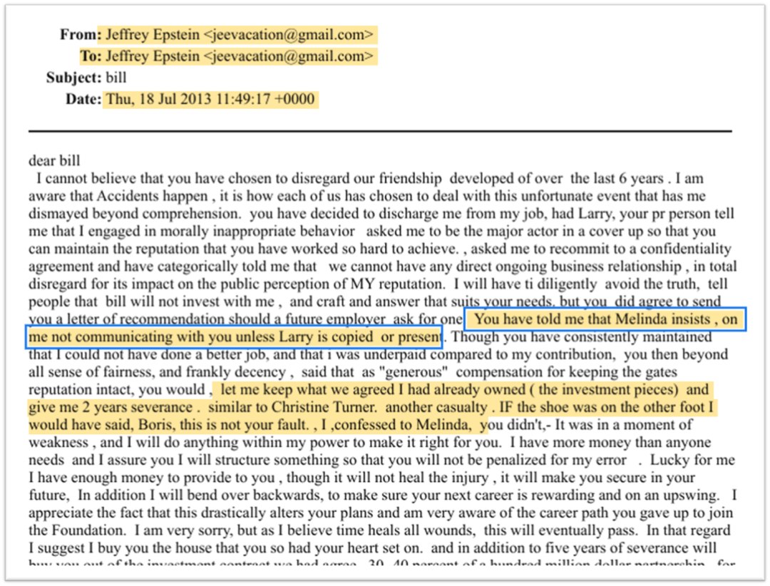 这封邮件进一步展示了当时就Boris离职的盖茨团队内部动态,看上去像是梅琳达在主导一场清理门户运动。至少,爱泼斯坦与Boris一方是这么看。