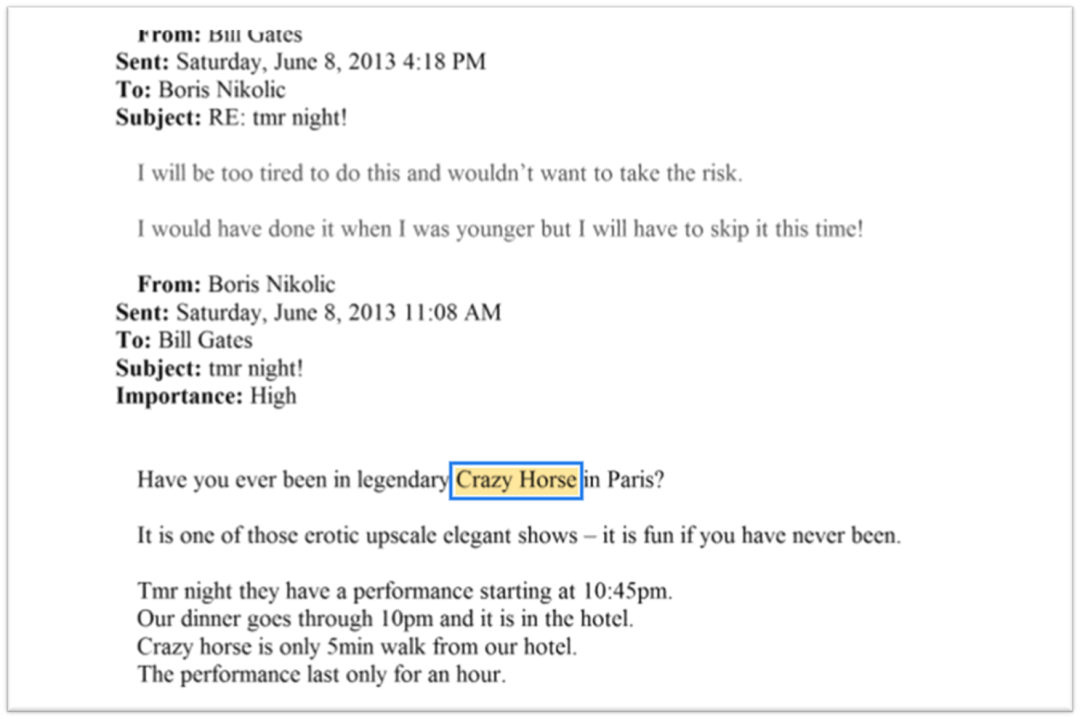 这里我们看不出“她”是谁,以及巴黎的坏邮件是什么,但似乎爱泼斯坦与Boris都认为一个月前的巴黎行导致盖茨要把他解职,而且和疯马有直接关联。