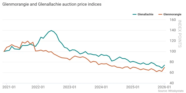 除头部品牌外,部分此前跌幅较大的苏格兰酒厂在1月出现更为明显的修复。格兰杰拍卖价格指数在1月上涨12%,成为当月表现第二好的品牌。此前,该品牌自2022年初高点至2025年末累计跌幅接近40%。