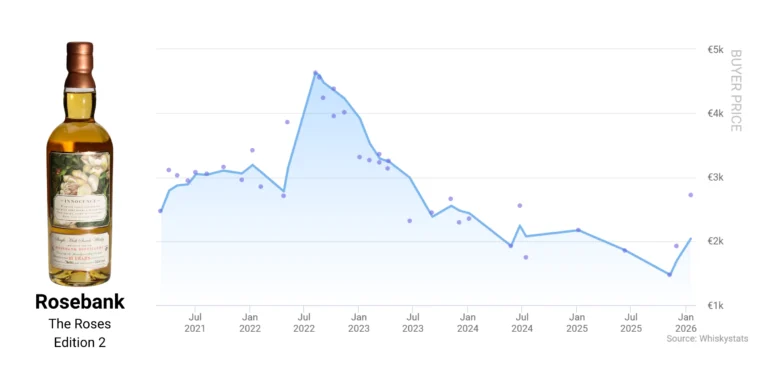 这一上涨部分抵消了罗斯班克在2025年累计15.7%的跌幅,也使其重新回到Whiskystats拍卖价格指数前十。具体酒款层面,罗斯班克第二版在2025年11月一度跌至1500欧元左右,但在1月拍卖中成交价已回升至2700欧元(含买家费用);罗斯班克32年第三批次的成交价亦在1月出现跳涨,相比12月均价上涨超过2000欧元。