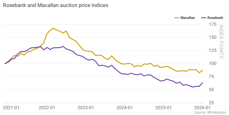 2026年1月,拍卖市场表现最突出的品牌为罗斯班克。Whiskystats数据显示,纳入统计的58款罗斯班克酒款,1月整体市场价值上涨12.3%,创下该品牌自2014年以来的最大单月涨幅。