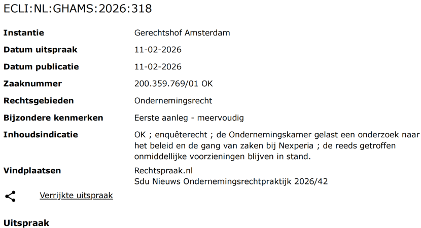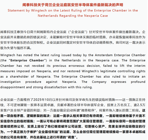 2月11日,阿姆斯特丹上诉法院企业庭对Nexperia(安世半导体)一案作出裁定,下令对这家总部位于奈梅亨、全球雇员超过12500人的半导体企业展开正式调查,维持此前对公司CEO的停职处分,并将大股东裕成控股所持股份继续交由法院指定的托管人管理。