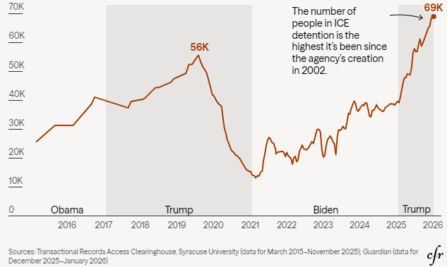 2025年5月,国土安全顾问Stephen Miller证实,政府已设定每日逮捕三千名无证移民的配额。(国土安全部后来又称不存在此类配额)据该机构统计,截至2026年1月初,近六万九千人被关押在ICE拘留所。