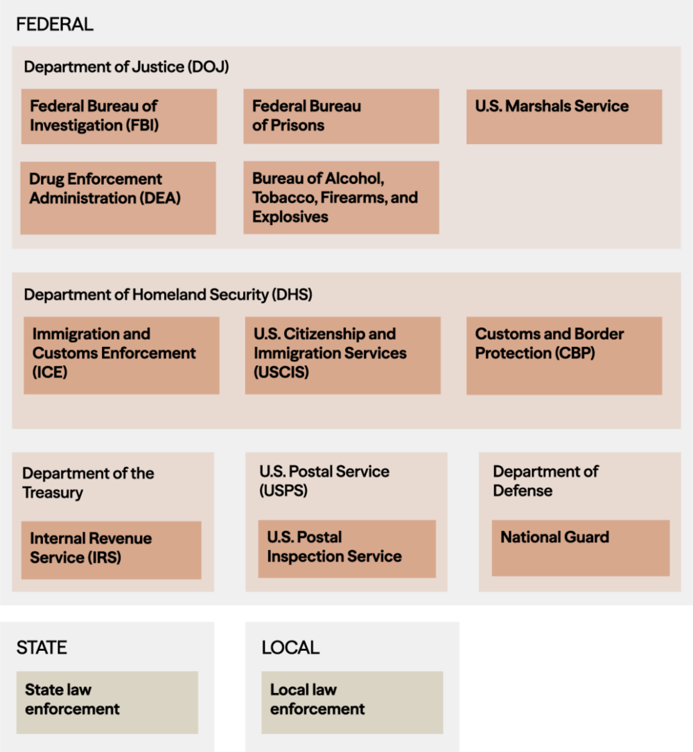 特朗普政府还将移民执法权和责任授予了多个其他联邦执法机构,包括缉毒局、联邦监狱局、美国法警局、美国邮政检查局以及酒精、烟草、火器和爆炸物管理局。拜登政府时期任ICE幕僚长的Jason Houser表示,这种联邦执法部门的职权“融合”将“对公共安全及公众对联邦执法机构的信任产生长期影响。”