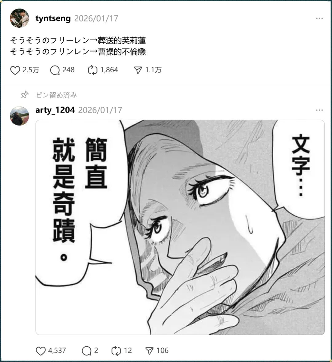 放到外语里也一样,比如日语里“葬送的芙莉莲”听起来很像“曹操的芙莉莲”、“曹操的不伦恋”,后来有了各种各样的奇葩二创,甚至官推都玩过这个梗。