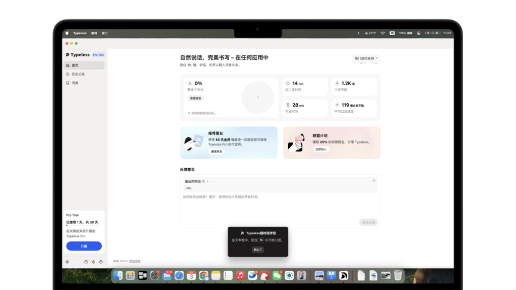 一开始试用Typeless的时候,作为一个不太习惯用语言来梳理想法和表达自己,也不需要长篇大论去表达想法的人,我会觉得它不适合我,更适合天天需要给出大量反馈的领导、Mentor、甲方人群。