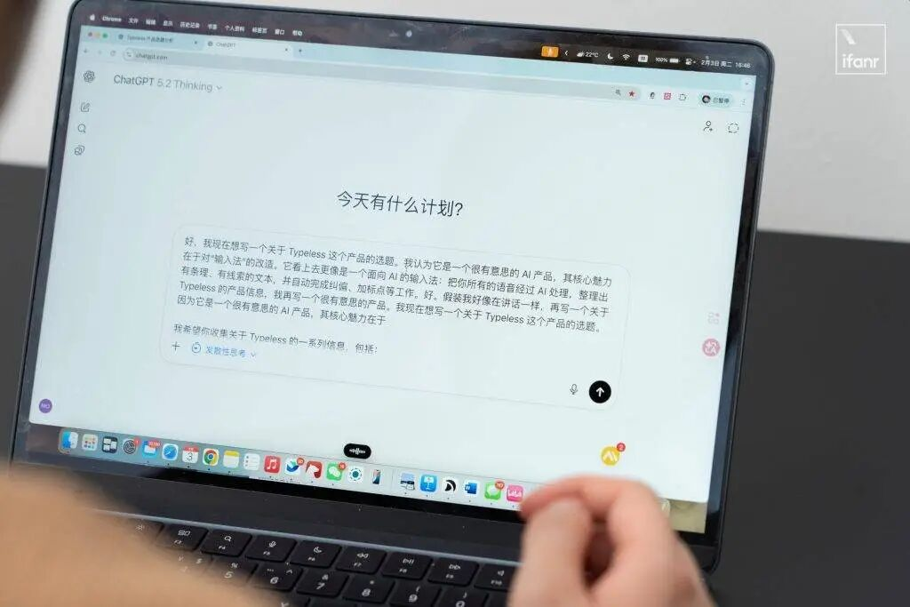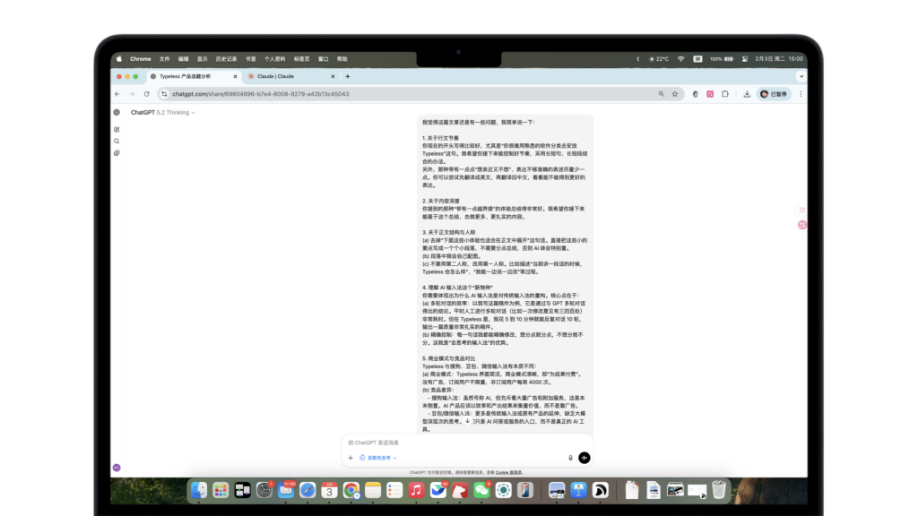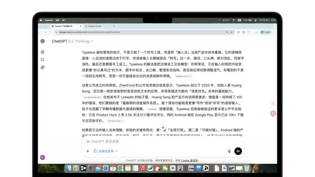 我很喜欢Typeless的在设备上全局的集成形式——手机上是输入法,电脑上是热键,让它可以像AI助手一般跨应用使用,这是ChatGPT无法给出的细节体悟。
