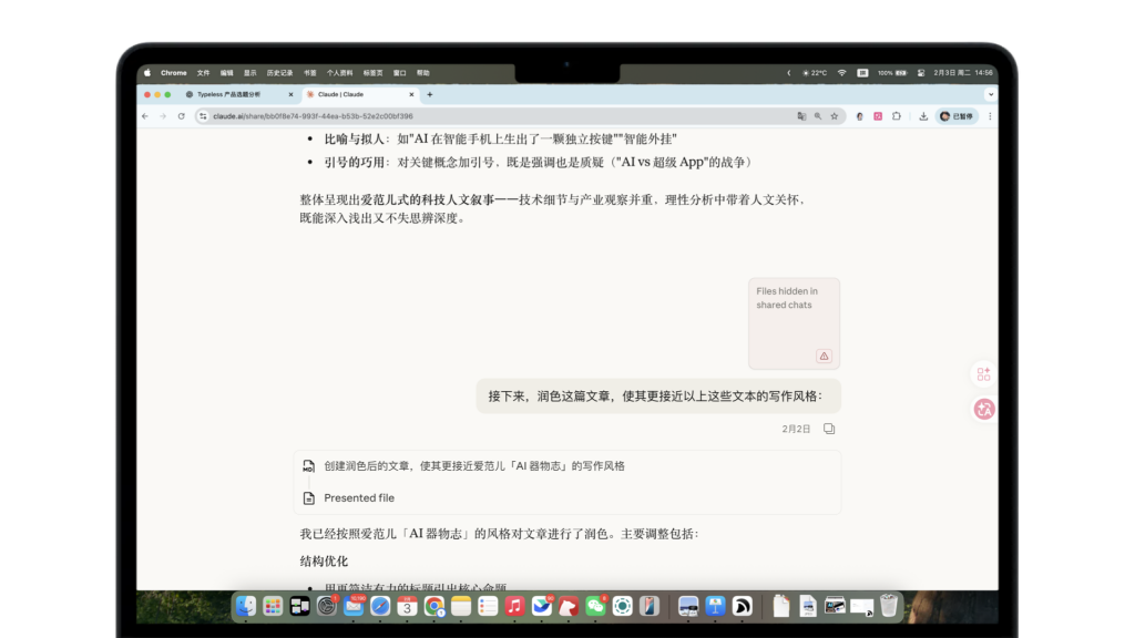 用Typeless的体验,更像是在给AI喂一份更丰富的语料,生成的内容有据可依,观点也够牢靠,AI更多只是负责把这些碎片变成更好读的文章。