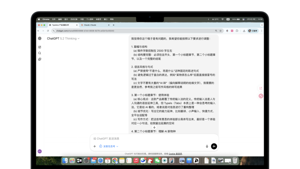 一开始,我们先抛出了一些初步的想法,关于Typeless这个产品的一些观点,以及资料收集和写作注意事项,这些「意识流」的口述被Typeless整理成条理清晰的文字,直接用作ChatGPT的提示词。