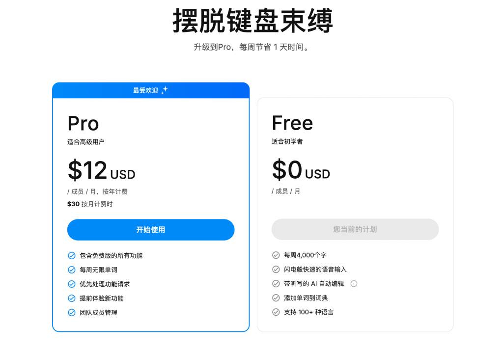 免费方案提供每周4000字转写;而付费没有字数的限制,每个月30美元,每个季度60美元,一年144美元。