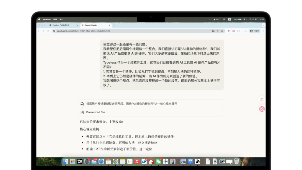 Claude的初稿也还有提升空间,这时候我们可以继续用Typeless帮我们转述一些相对更细节的修改建议,直到满意为止。