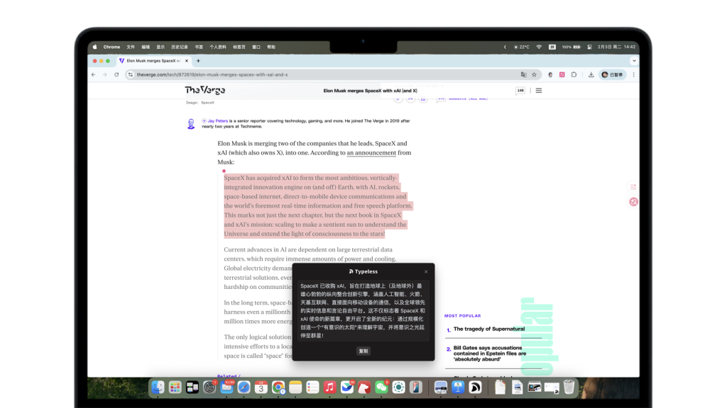 但进一步探索使用之后,我觉得我还是狭隘了。在这个AI时代下,Typeless不应该只是一个独立的App,更应该成为一种「标配」无处不在。