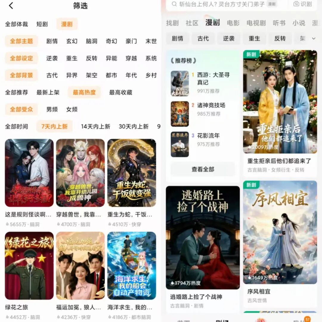 行业浩浩荡荡的宏大盛景,化为宋晨观剧时的真实体验:红果短剧页面,漫剧和短剧并列成为一级入口;收藏列表栏多了漫剧分类;完整看完一部漫剧后,精选推荐页的AI漫剧自此源源不断。