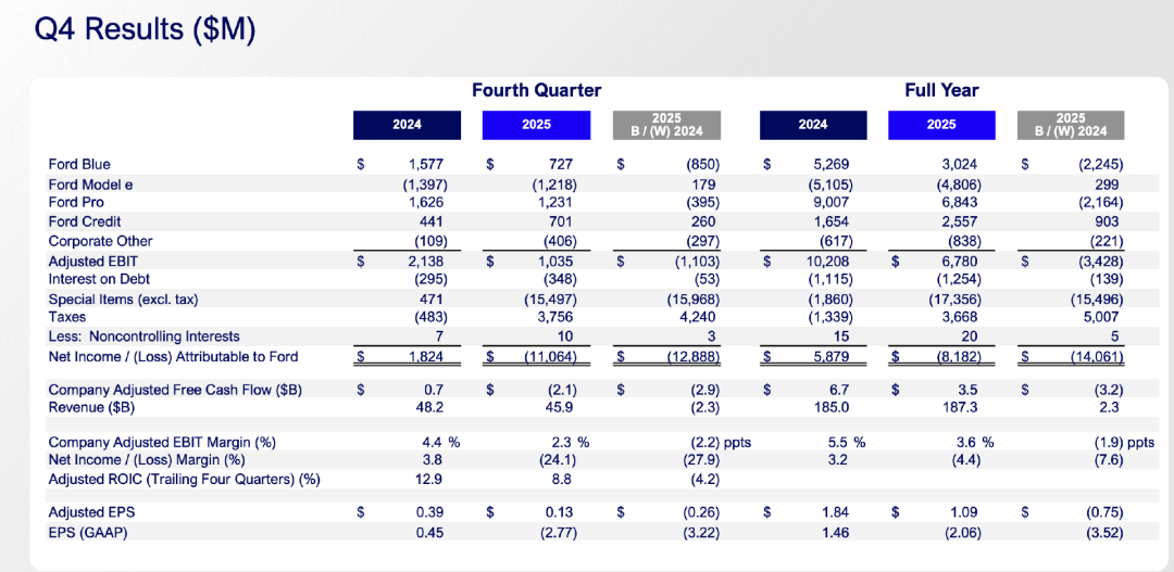但电动部门接连的亏损,也让福特不得不重新审视此前对于电动车业务的大规模投入,这也是为何福特在2025年最终录得巨额亏损的原因。