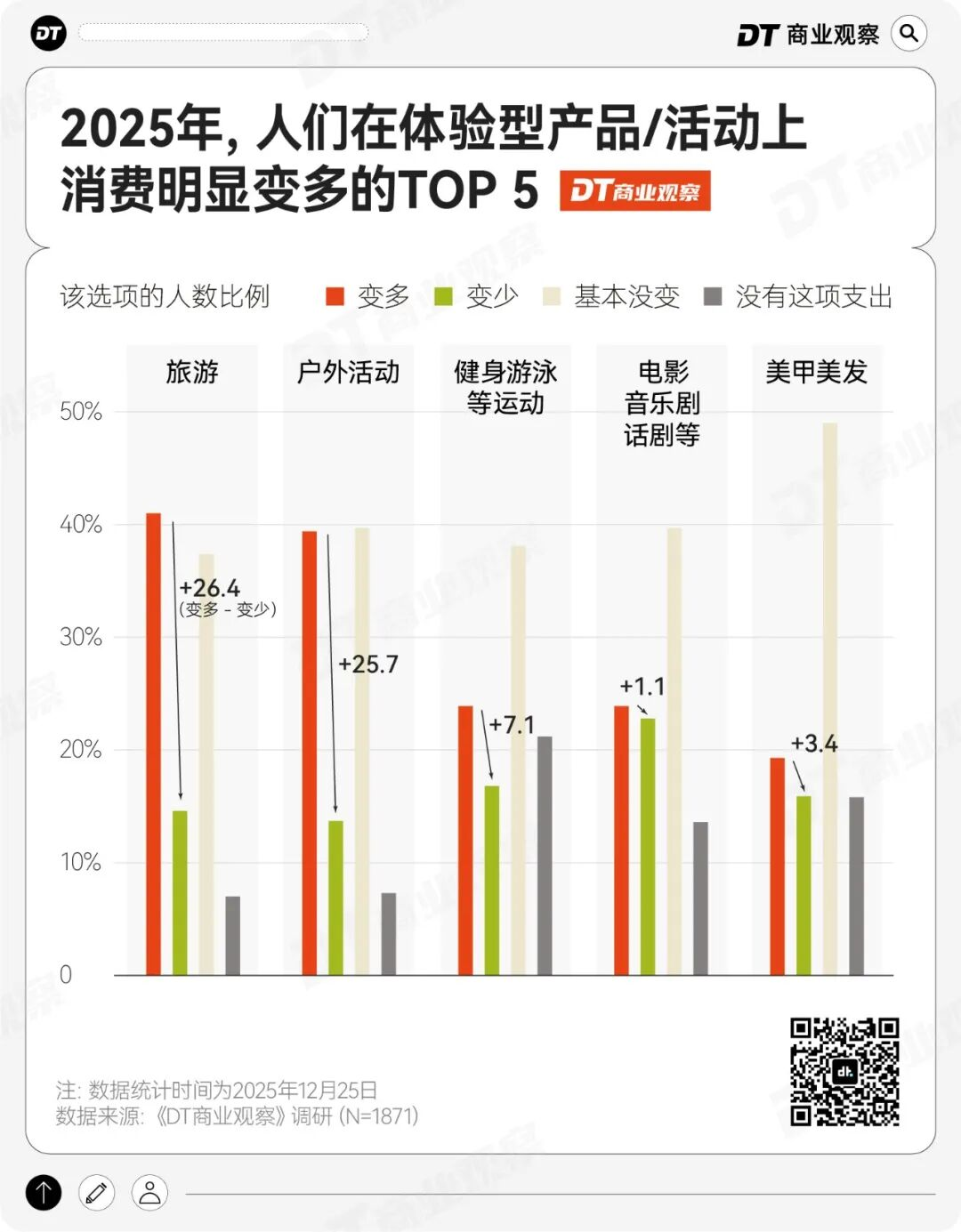 但并非所有体验型消费都在增长。在调研中,KTV(净值-11.4个百分点)、剧本杀(净值负9.9%)等室内社交娱乐业态持续萎缩。
