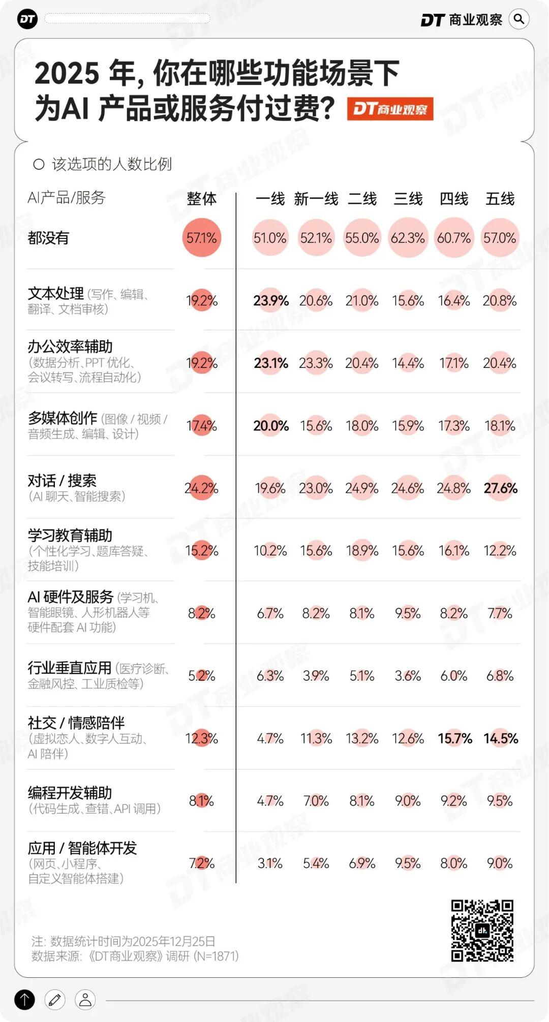 一线城市人群正努力把AI调教成自己的“电子牛马”——付费率最高的TOP 3分别是AI文本处理、办公效率辅助和多媒体创作。比如写周报、做PPT、剪视频,能外包给AI的绝不自己干。