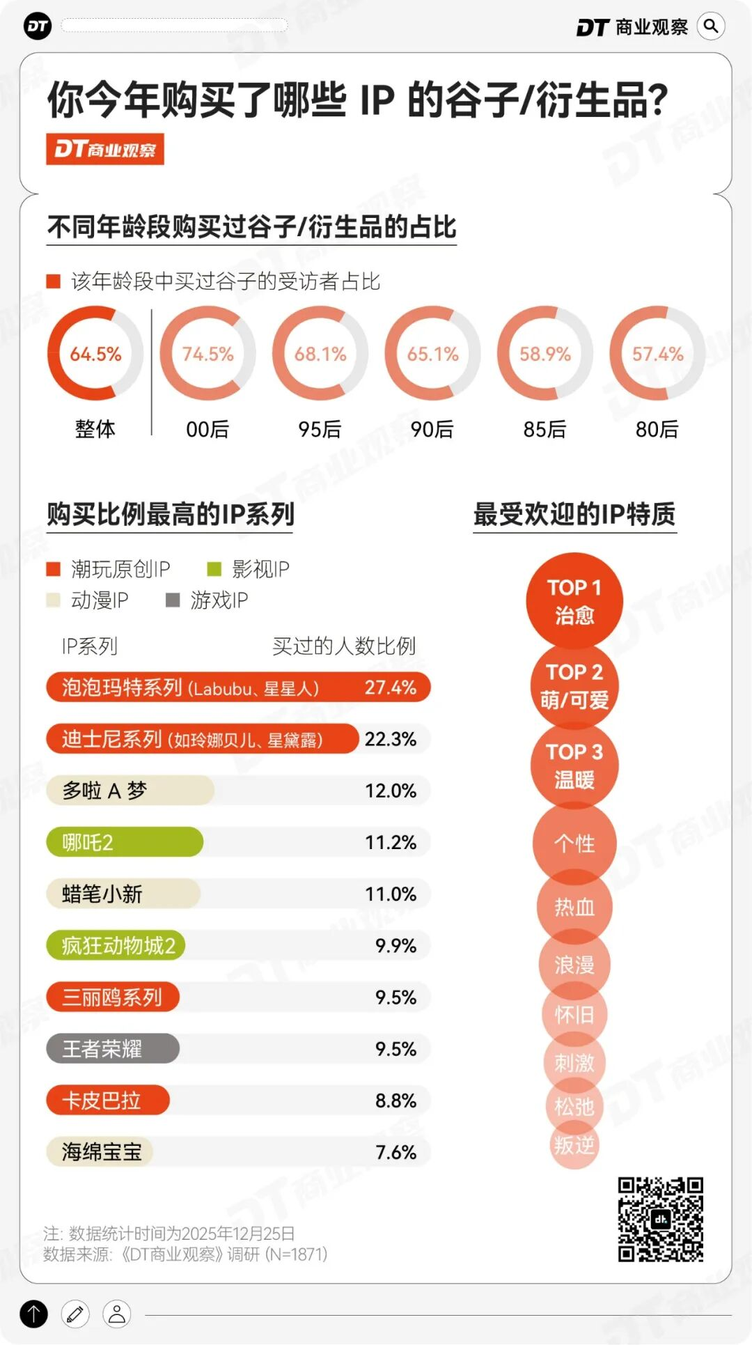 调研显示,64.5%的受访者买过谷子或IP衍生品,越年轻越爱买,超过7成00后有过谷子消费经历,比例在所有年龄段中最高。