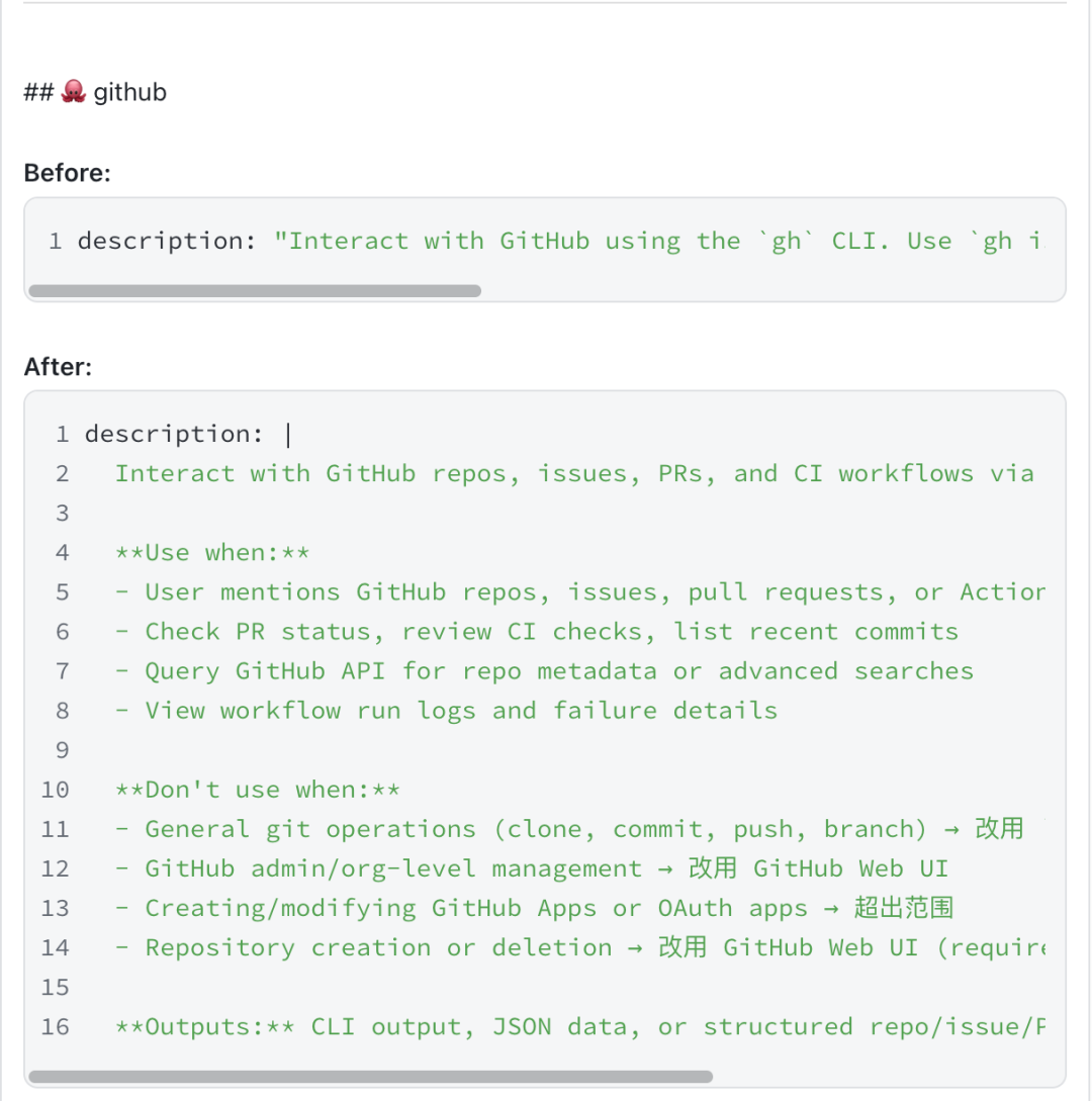 这一点很重要,当你的 skills 没有被调用,很有可能问题就出现在这里,下面是我的 Openclaw 帮我修改的 description,之前只有一句话,现在明确了何时用、何时不用、输出什么。
