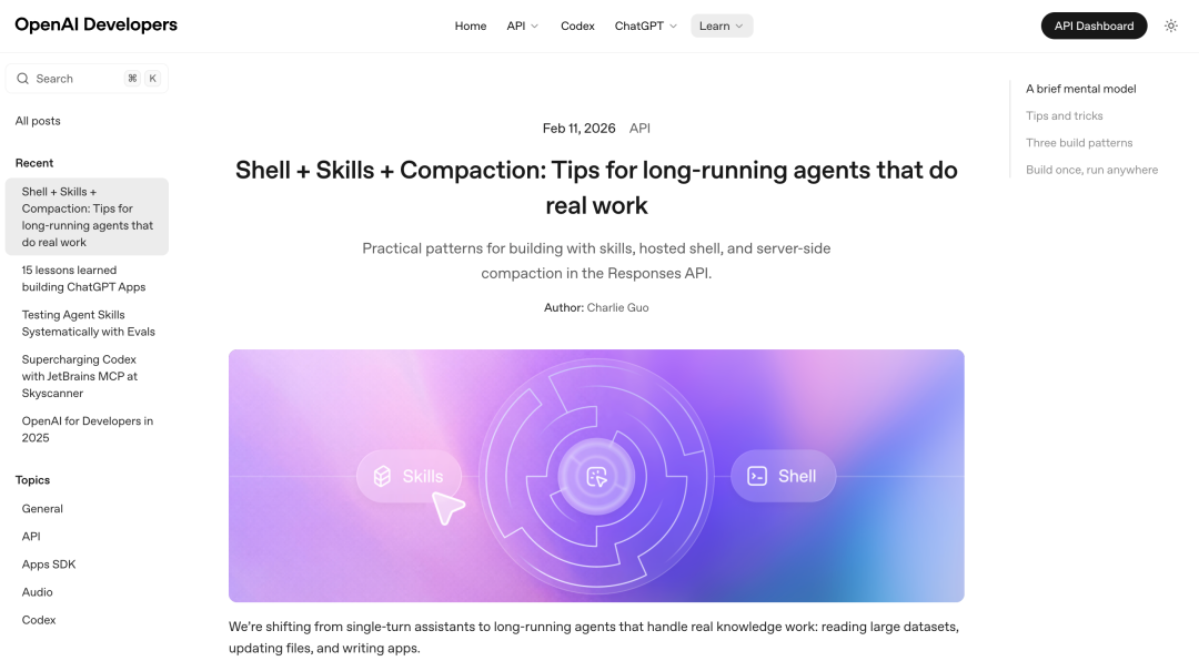 OpenAI Developers 最近更新文章了,分享了一些让长期运行的 agents 更高效的技巧,核心是三样东西:Skills、Shell、Compaction。