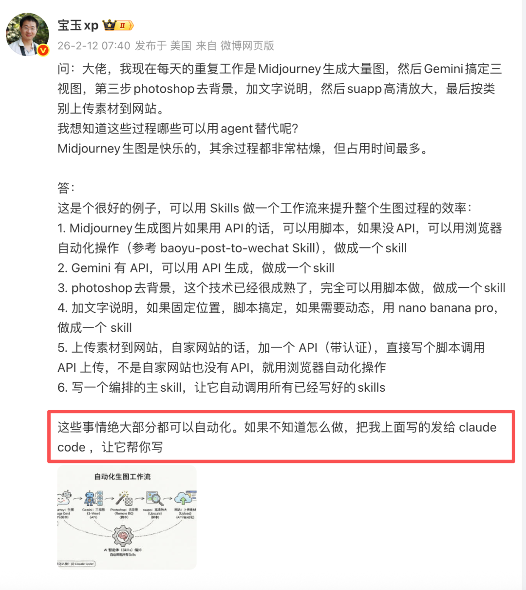 第一条来自宝玉老师——可以把自己的工作拆解下,拆解完了,如果不知道怎么做 skills,把内容发给 claude code ,让它帮你写。