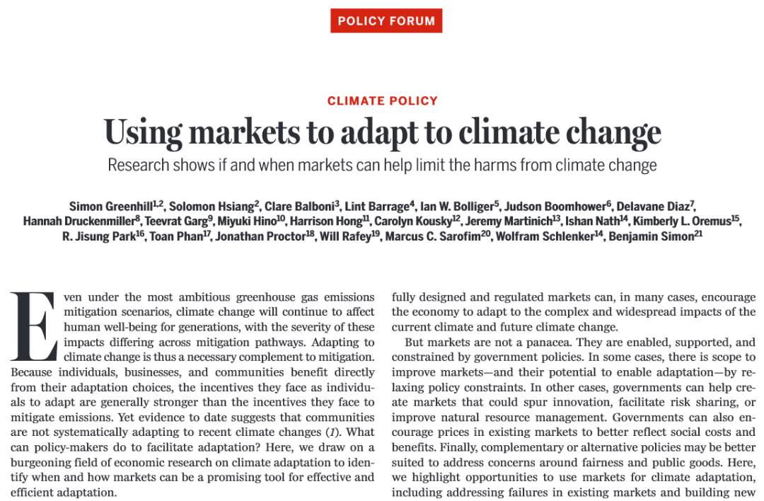 提到气候适应,我们会想到政府建海堤、修水库的宏大工程。今天发表在《科学》(Science)的政策论坛文章,揭示了一个被忽视的路径:市场。如果使用合理,也能成为气候适应的高效工具——通过价格信号、风险分担、技术创新,让个人、企业主动参与适应,用更灵活的方式降低气候风险。