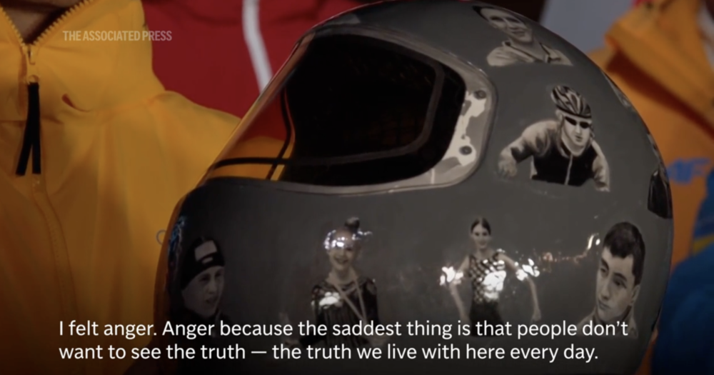 26岁的乌克兰钢架雪车运动员赫拉斯克维奇来到米兰,但不能参赛,因为他佩戴了一个特别的头盔。