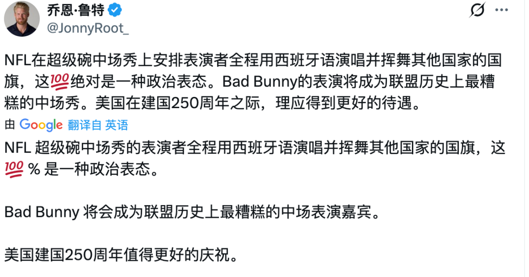 等Bad Bunny表演完之后,别说红脖子了,就是一些相当中立的人士都绷不住,认为他在这种重要场合展示了太多异国元素,不符合美国优先的精神。