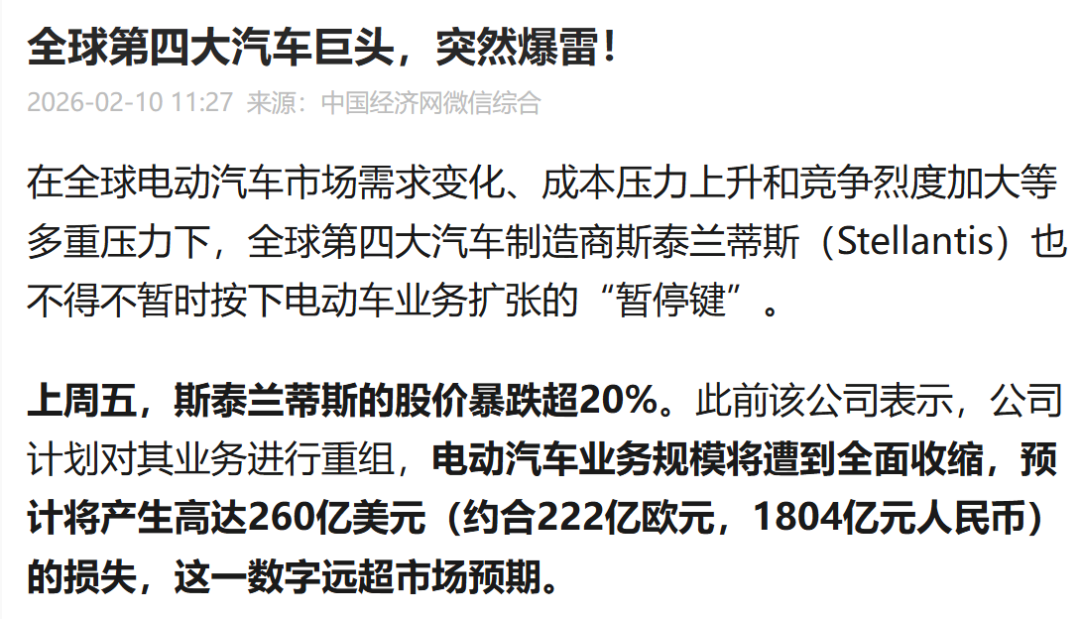 2025年福特汽车净亏损81.82亿美元,利润创下近5年历史新低,全球市场销量同比下降约2%,减至439.5万辆,排在全球汽车销量排行榜第七位,已经被中国车企比亚迪超越。另一位仁兄Stellantis更是奇葩,说是要缩减电车业务,会造成260亿美元亏损,这报告还是刚出的,媒体都直接用“爆雷”来形容了。只剩通用还稍微好点,2025年卖出为450.7万辆,拿到了27亿美元的净利润,给自己续了半条命,所以还有心思打超级碗广告。