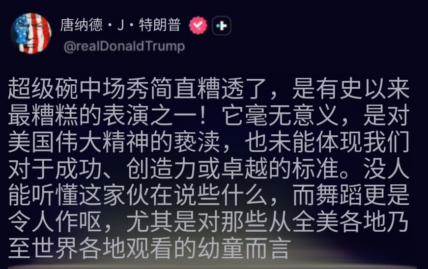 我们必须先从中场秀开始讲,因为有位场外评委意见很大。观看完本次超级碗的中场秀之后,懂王当即发推爆锤,称之为“史上最糟糕”,怒斥其“亵渎美国的伟大精神”、“令人作呕,带坏小孩”……
