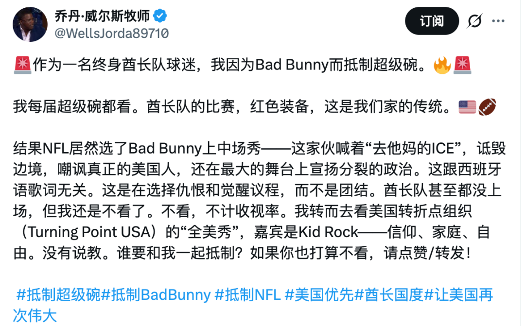 在Bad Bunny上台之前,懂王支持者们光是听说中场秀由他表演,就已经气炸了,在推上破口大骂,说他帮助不法分子,嘲讽真正的美国人,直接呼吁集体抵制。
