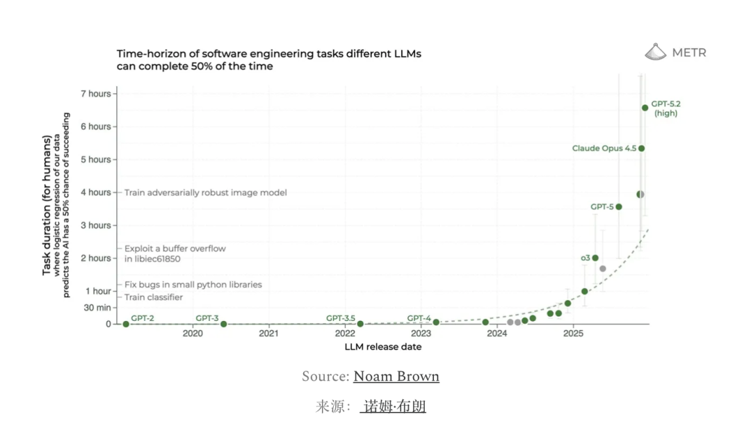 但这一次不同。METR(一家顶尖的AI安全研究机构)的数据揭示了一个惊人的规律:AI模型完成任务的复杂度(以人类所需时间衡量),大约每半年就翻一番。