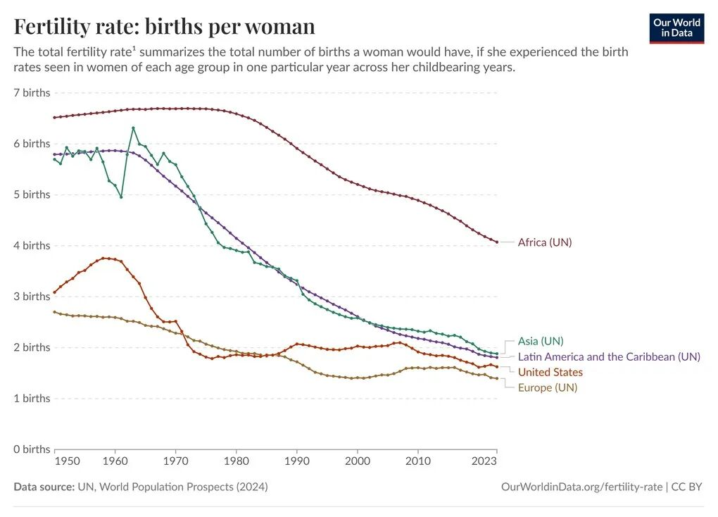 我们的生育率持续暴跌,且看不到底。如果AI想减少人类人口,它只需要坐在那儿,看着我们自己完成这个过程。