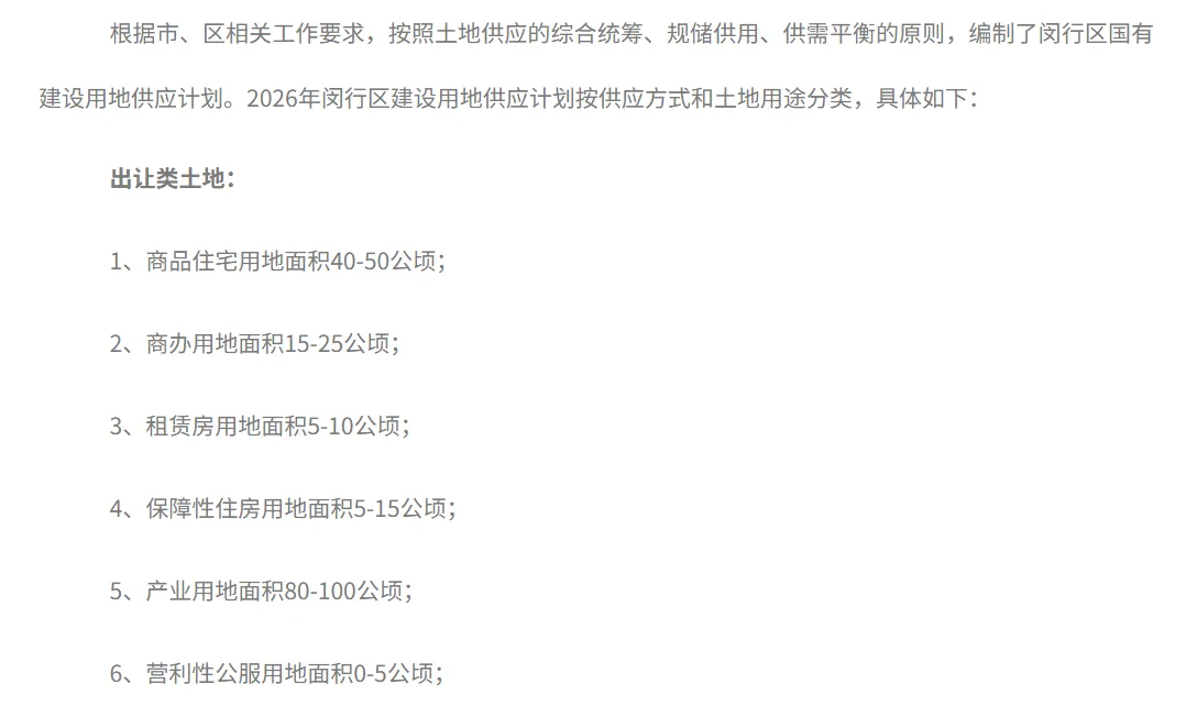 比如上海闵行区2026年的供地计划,产业用地(80-100公顷)远远多过商品住宅(40-50公顷),还单独列出了租赁和保障房用地。