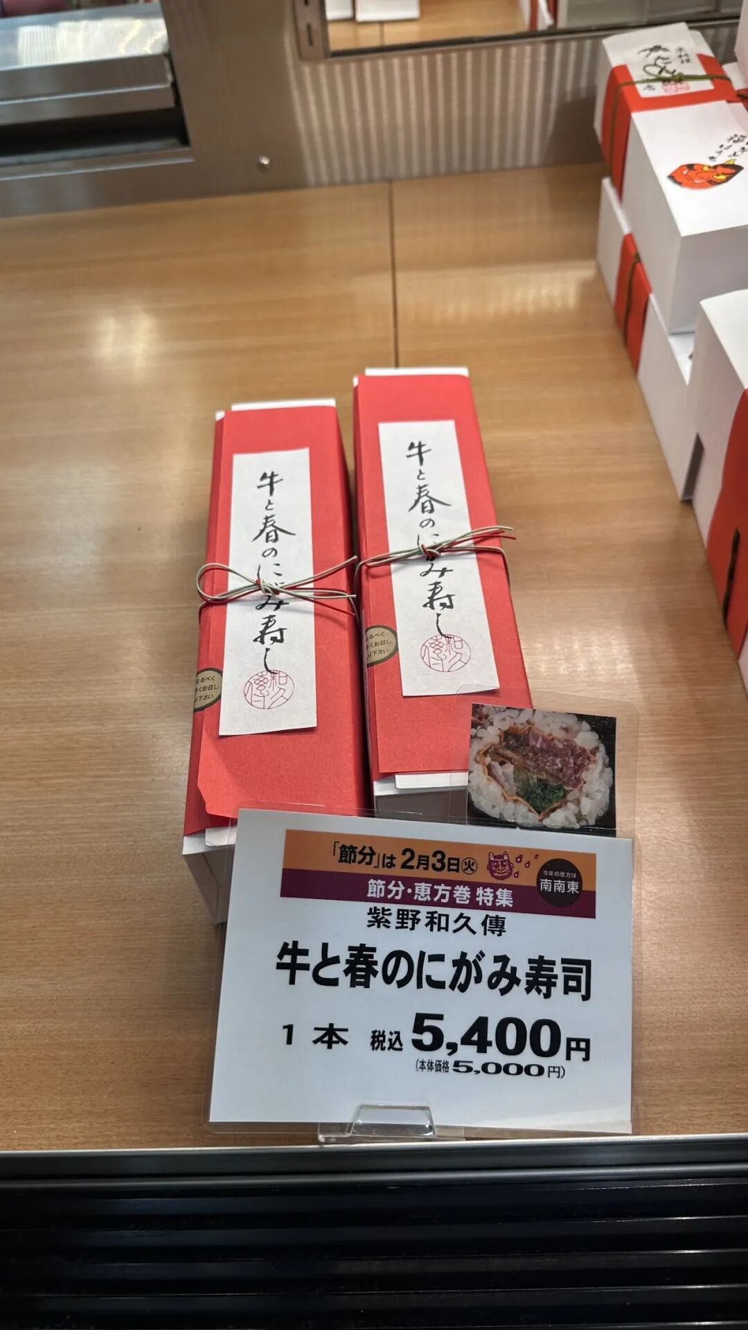 接着便是价格问题。惠方卷也有“阶级体”,售价差距颇大:711便利店里,不到四百日元便能买到一条“幸福的惠方卷”;而在高岛屋,最昂贵的则是怀石料理名店紫野和久传推出的高级和牛惠方卷——每条售价高达五千四百日元,且限量二十个。