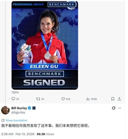 但现在,Benchmark似乎准备打破自己的常规。近日,有媒体爆料称中国自由滑雪运动员谷爱凌将在冬奥会结束后加入Benchmark,担任高级投资经理(Senior Associate),Benchmark的灵魂人物比尔·格里(Bill Gurley)则在社交媒体上证实了这一消息,表示:“我们本来想保密”。
