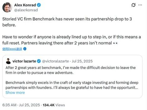 尤其是2024年3月到2025年8月期间,至少有3名合伙人宣布离职,坊间一度盛传Benchmark只剩下了3位合伙人。福布斯时任高级编辑孔拉德(Alex Konrad)的表态代表了大多数人的意见:这是Benchmark历史上从未发生过的事情,其中还有仅仅只工作了两三年的合伙人,这家老牌机构是不是要彻底推倒重建了?