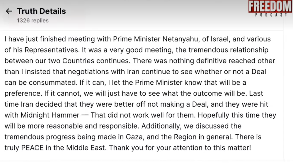 特朗普在“真实社交”上展示其与内塔尼亚胡的沟通结果