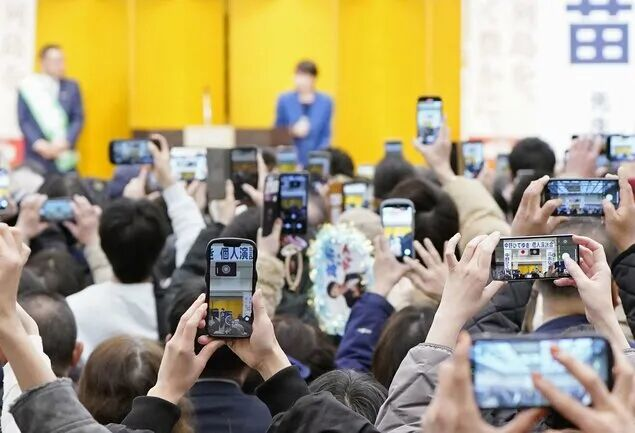 高市早苗出现在助选活动现场,大批选民立刻用手机对准台上。共同社