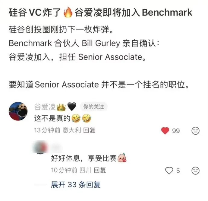 起因是一张截图显示,Benchmark合伙人Bill Gurley称谷爱凌将入职风投。此时正值冬奥会关键时刻,谷爱凌本就备受瞩目。很快,国内自媒体不加证实大肆报道,轰动一时。