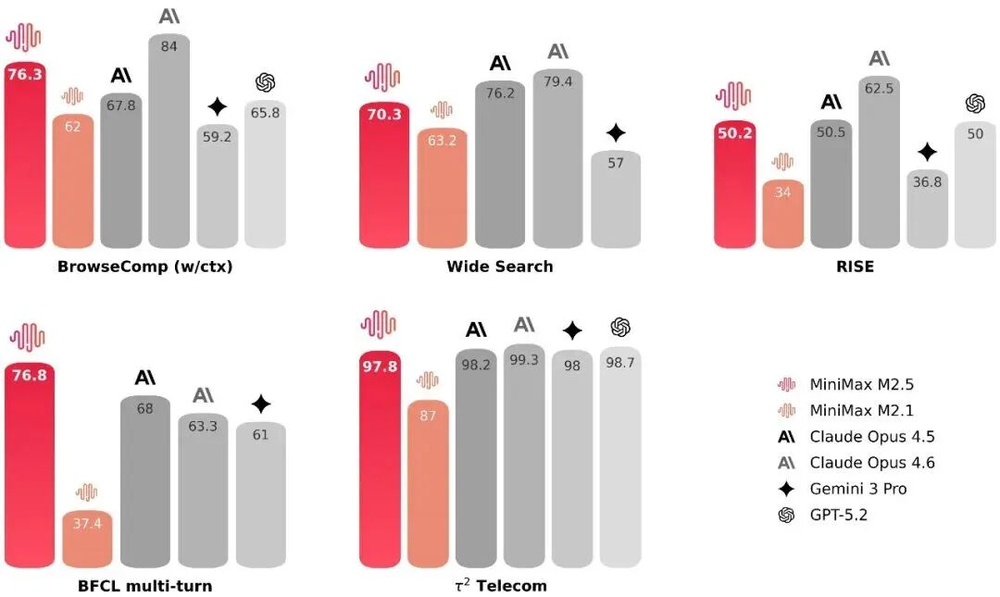 M2.5的工具调用能力非常强悍,在多项工具调用的指标均为头部水平。搜索是Agent最常用的工具,MiniMax为此还自建了一个评测集RISE(Realistic Interactive Search Evaluation),专门测真实专业任务上的搜索能力。