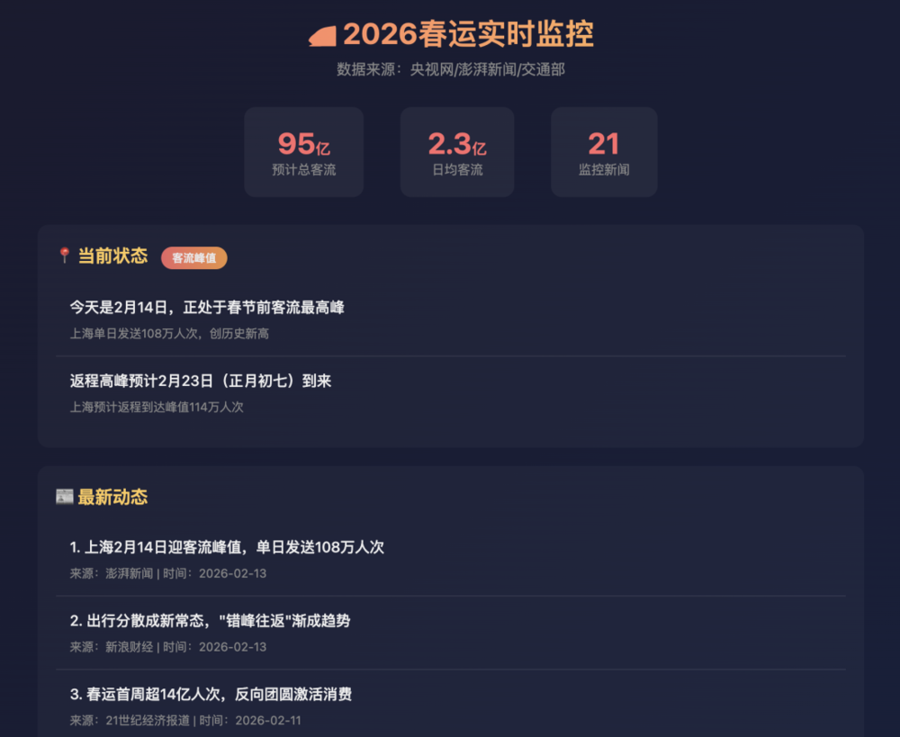 我让它写了一个2026年的春运实时监控,每小时自动监控并更新网页,得到的网页是这样的: