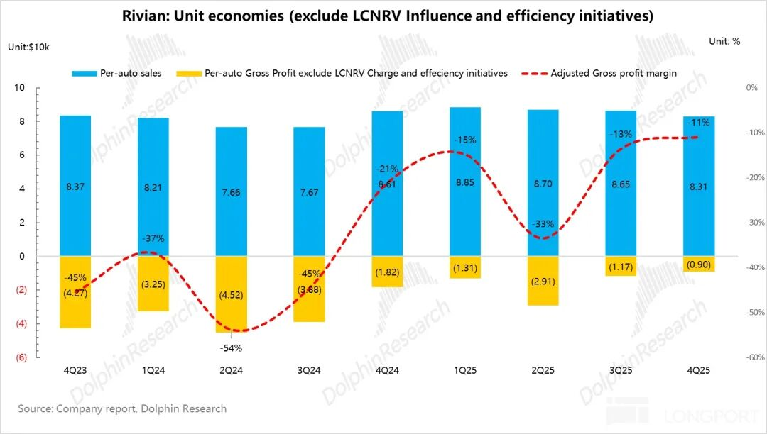 3)卖车毛利率继续上行:四季度卖车毛利率-7%,环比上季度提升4.4个百分点,而去除碳积分的贡献后环比提升至-11%,主要由于单车可变成本的下行(Rivian持续降本+关税负面影响减弱+EDV高毛利),对冲了卖车单价下滑与单车摊折成本上行影响。