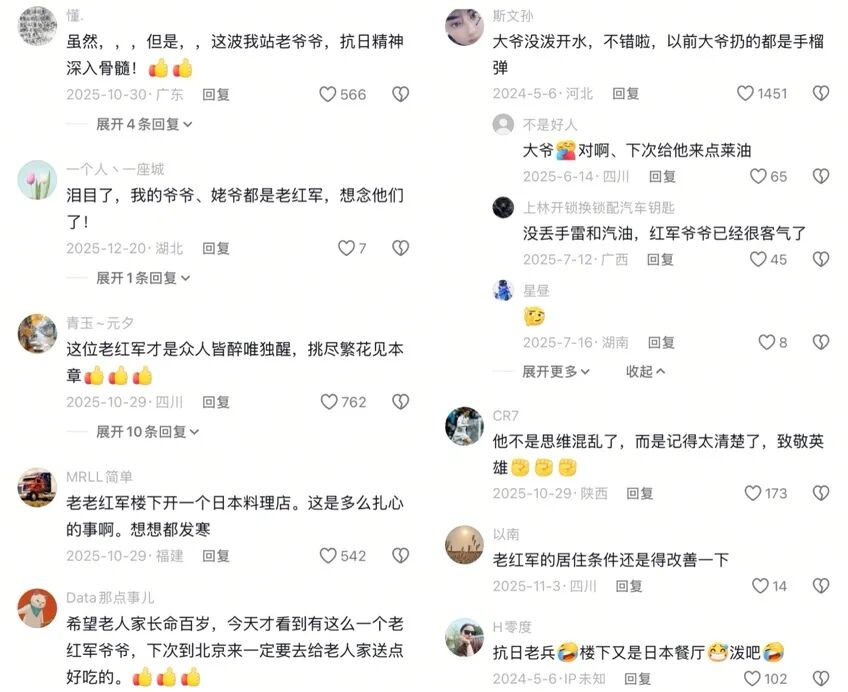 而在传播过程中,这类内容呈现出明显的“情绪大于事实,立场大于判断”的特征。即使评论区中已经有人指出故事是伪造的、信息不可信,但这些理性声音往往被情绪洪流淹没。更多的评论集中在“向老兵致敬”“为老兵鸣不平”“心疼英雄”“气愤不公”,甚至进一步外溢为对日本、美国等国家的敌对情绪表达。对许多观众而言,视频的“态度正确”“情绪到位”,远比“是否真实”更重要。