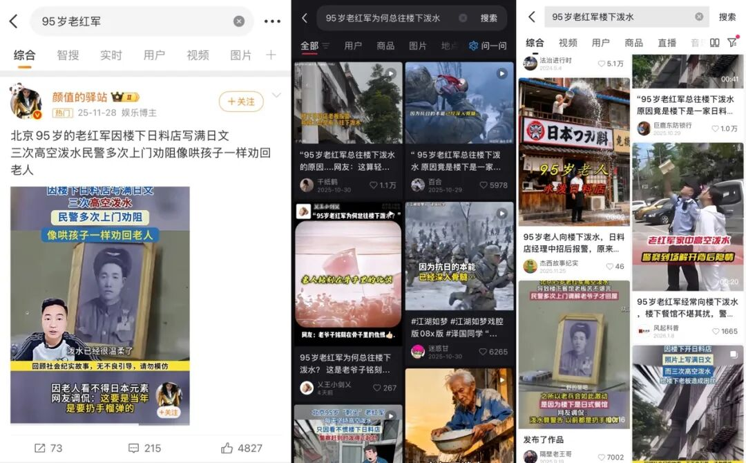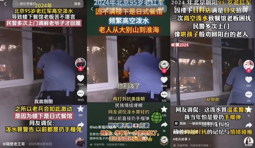 近日,多条以“95岁老红军向楼下日料店泼水”为主题的视频在各大网络平台集中传播。相关视频虽在画面呈现与剪辑方式上各不相同,但其叙述内容高度一致:视频中,一家日式餐饮店报警称,楼上老人多次向楼下泼水,影响正常经营;民警到场后发现,涉事老人系一名95岁的老红军。视频进一步指出,老人之所以实施上述行为,系出于对“日本元素”的反感。