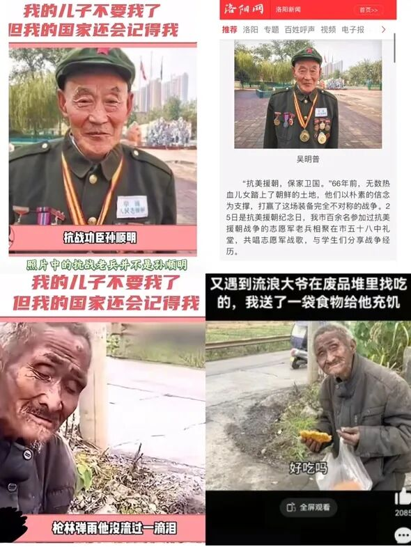 这样的例子还有很多:认为自己所属并非主力部队,深藏荣光,以致晚年穷困潦倒的齐修体(经核查,齐修体是因为自己国军身份不敢领取抚恤金,详见中国新闻网2014年7月10日的报道[6]);寻侄女过程中在桥洞下被曾帮助过的人抢9万积蓄的金长发(经核查,金长发在1953年朝鲜金城牺牲)……然而这些内容获得很高的流量,批量生产此类视频的博主也已成规模。