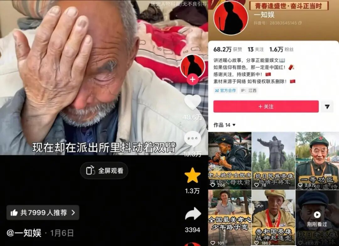 现如今,以老兵为主角的虚假视频层出不穷:它们大多用大量无关视频素材拼接,辅以文字解说,将一些有关于中日冲突、家庭伦理的叙事“移花接木”到老兵身上。