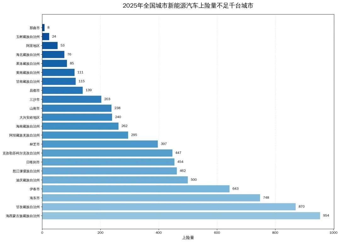 2025年新能源汽车上险量不足1000台的城市,无疑是中国新能源汽车版图的「绝对死角」。