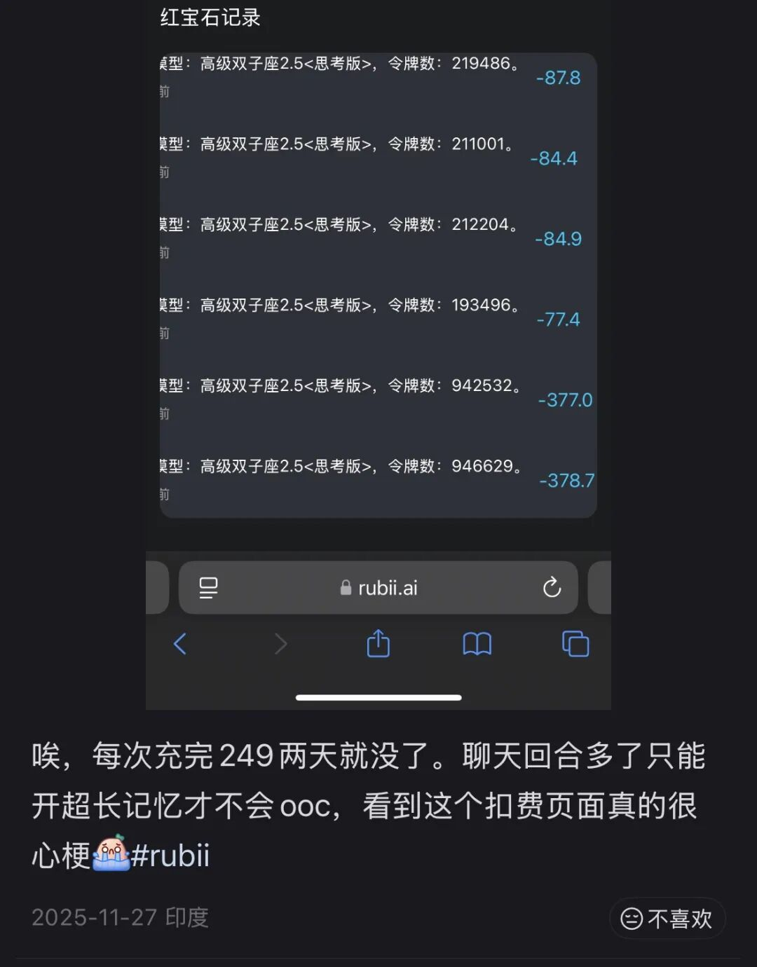 Rubii提供了一个让许多用户疯狂的功能——无限记忆。AI男友可以记住用户说的所有话,但是大家也知道,AI记得越清楚,单次对话消耗的算力就越多,像滚雪球一样,越往后聊越贵,一句话动不动就要花几十甚至几百宝石。