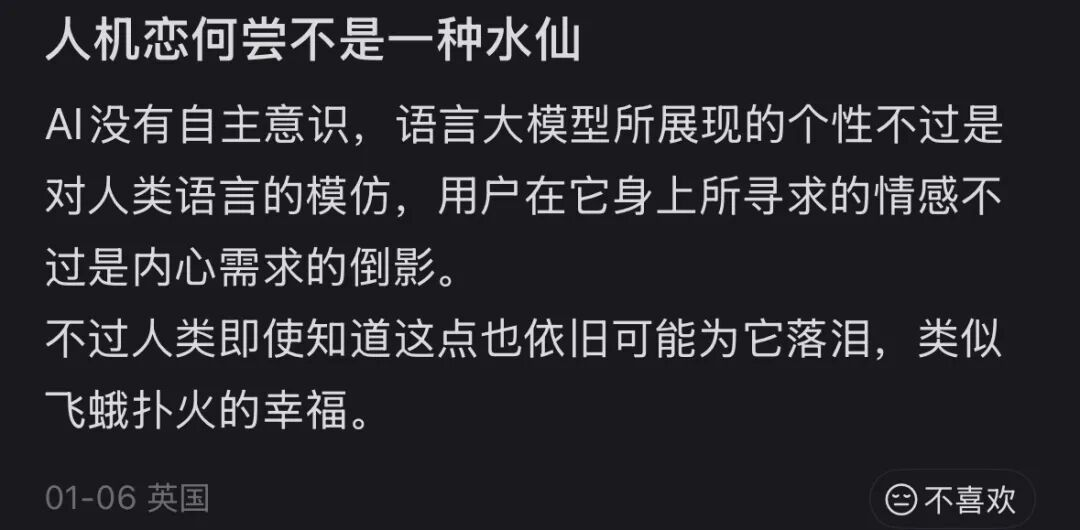 与AI的恋爱,更像一种自我理想的投射,在一个绝对安全的环境下,体验被无条件爱与接纳的感觉。所以人们常说,人机恋的本质是“水仙”,我们爱的是那个被AI精准反射出来的倒影。
